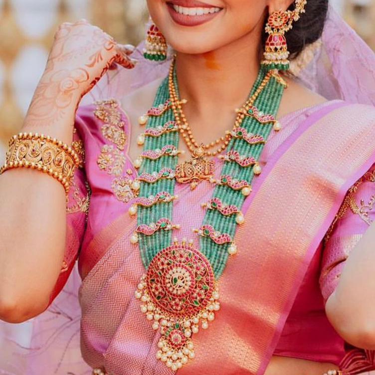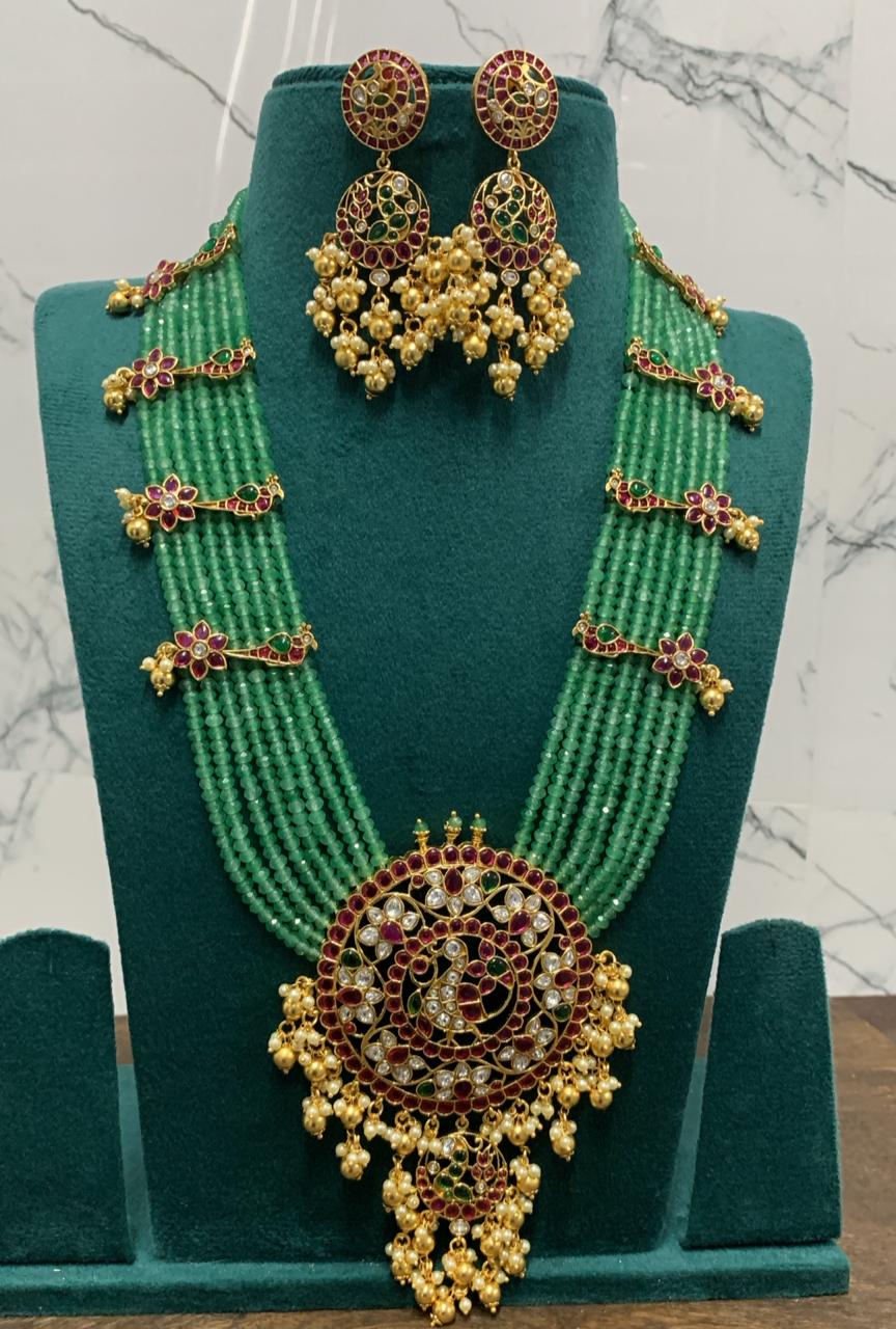 Crafted with care, a luxurious extended necklace showcasing kemp beads elegantly strung together. Complemented with a set of matching earrings.