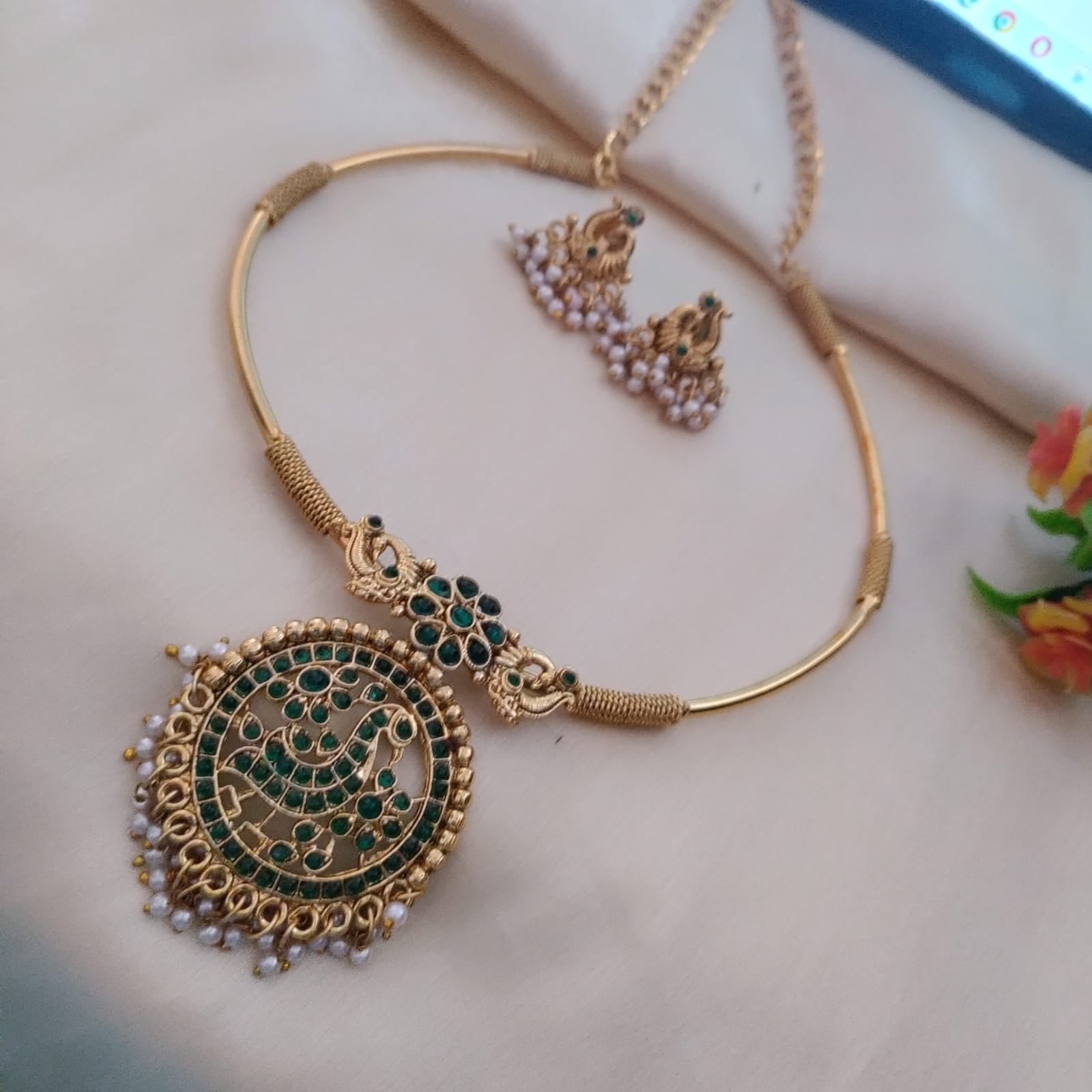 The pendant, intricately crafted in the shape of a peacock, showcases detailed feathers and vibrant colors, capturing the regal and graceful essence of this majestic bird. Paired with a tube Hasuli, which likely features a sleek and contemporary design, the set achieves a harmonious balance between tradition and modernity.