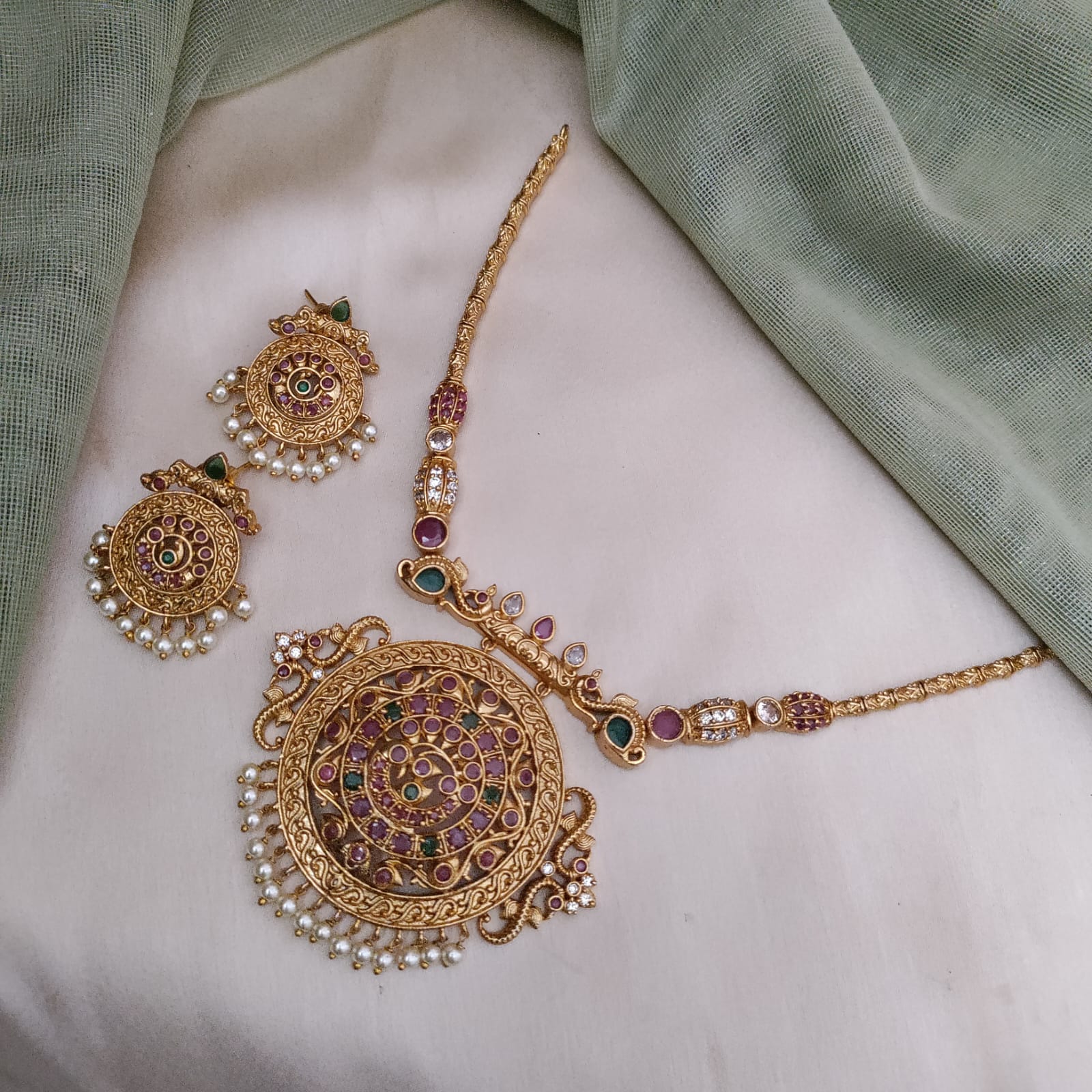 The round pendant and Hasuli set together offer a blend of classic charm and contemporary elegance, making it a versatile and eye-catching accessory.
