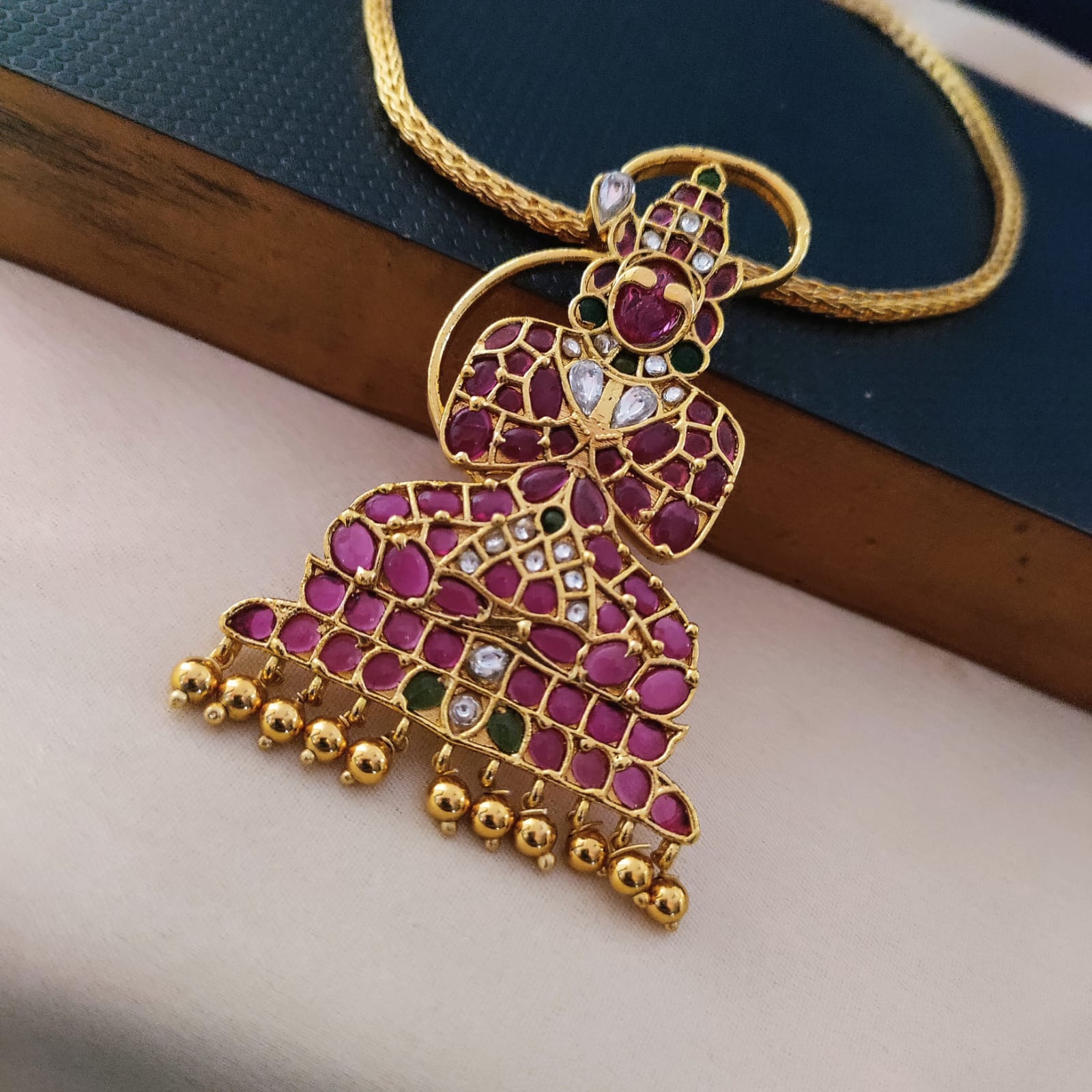 The Deity pendant, depicting a revered figure or symbol associated with divinity, adds a sacred and cultural dimension to the set. Paired with a Hasuli, the choker-style necklace enhances the overall elegance and creates a cohesive look. The pendant may feature intricate detailing, and the Hasuli could complement the theme with its design or embellishments. This set is not only a stylish accessory but also a meaningful representation of faith and spirituality. It's suitable for occasions where you want to express both your sense of style and devotion. The Divine and elegant Deity pendant with Hasuli set is a tasteful fusion of spirituality and timeless charm.