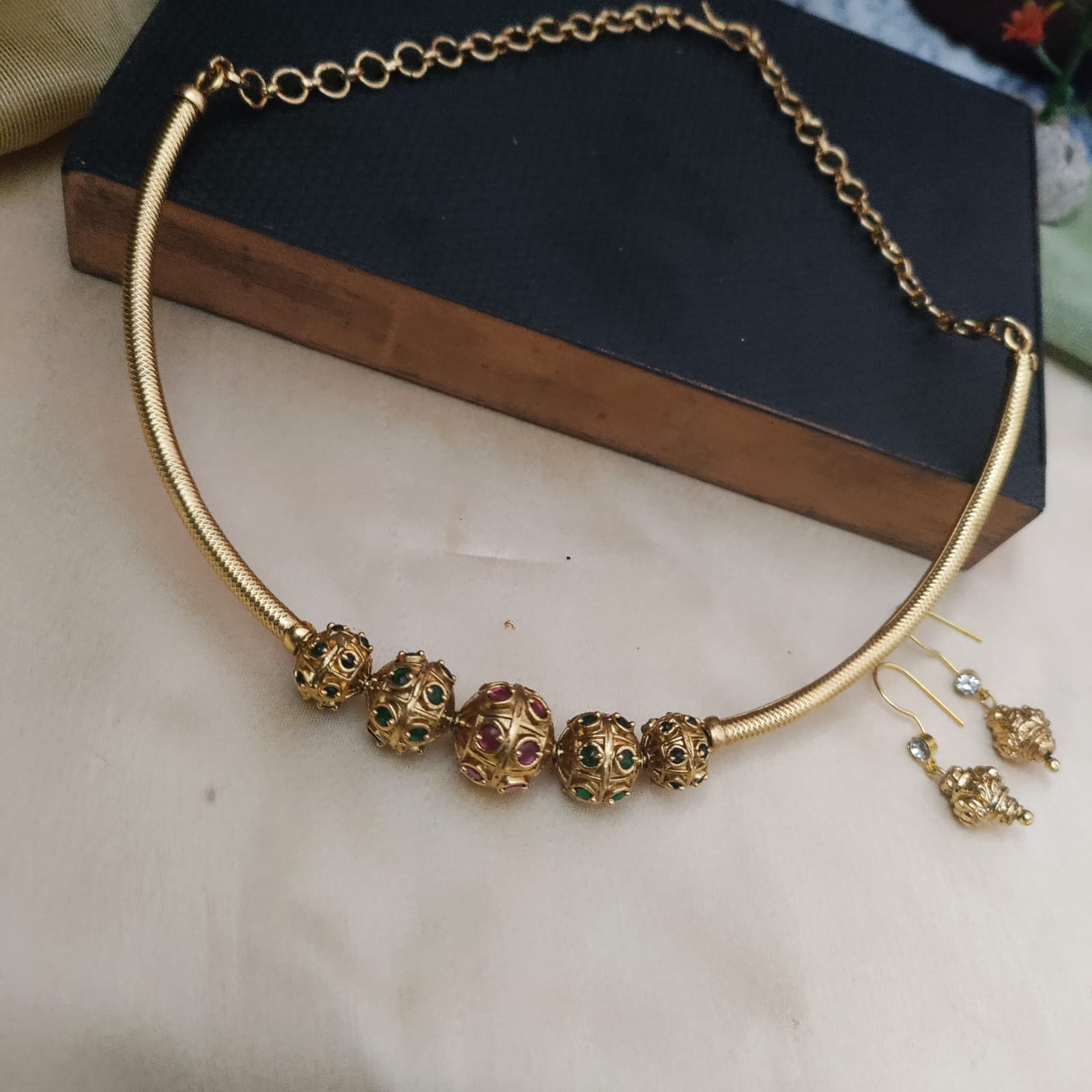 A golden stone-studded ball with a tube necklace set combines classic elegance with a touch of modern sophistication. The necklace features a series of golden balls, each adorned with stones, creating a luxurious and eye-catching effect.