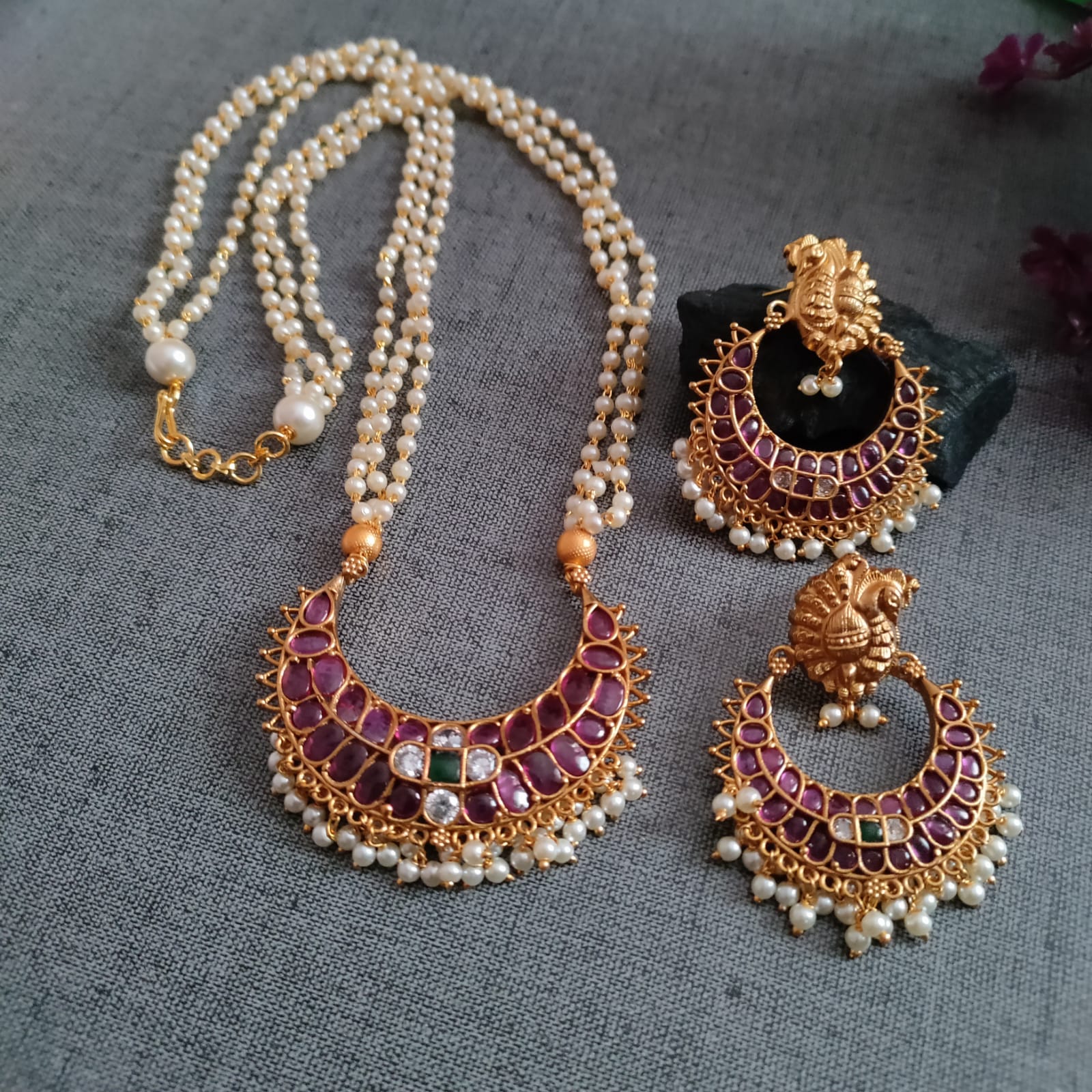Long necklace adorned with lustrous pearls and kemp stones with matching peacock earrings.