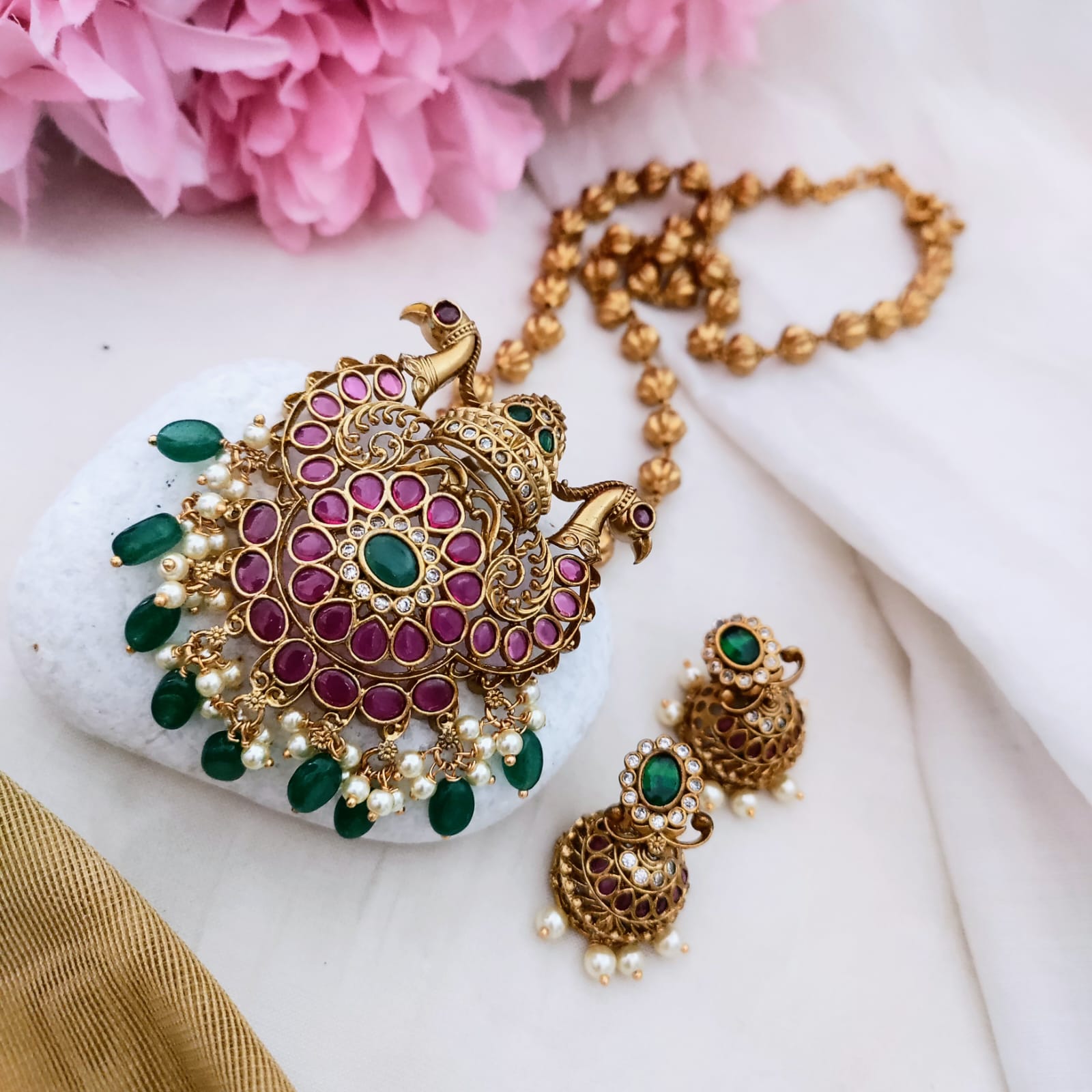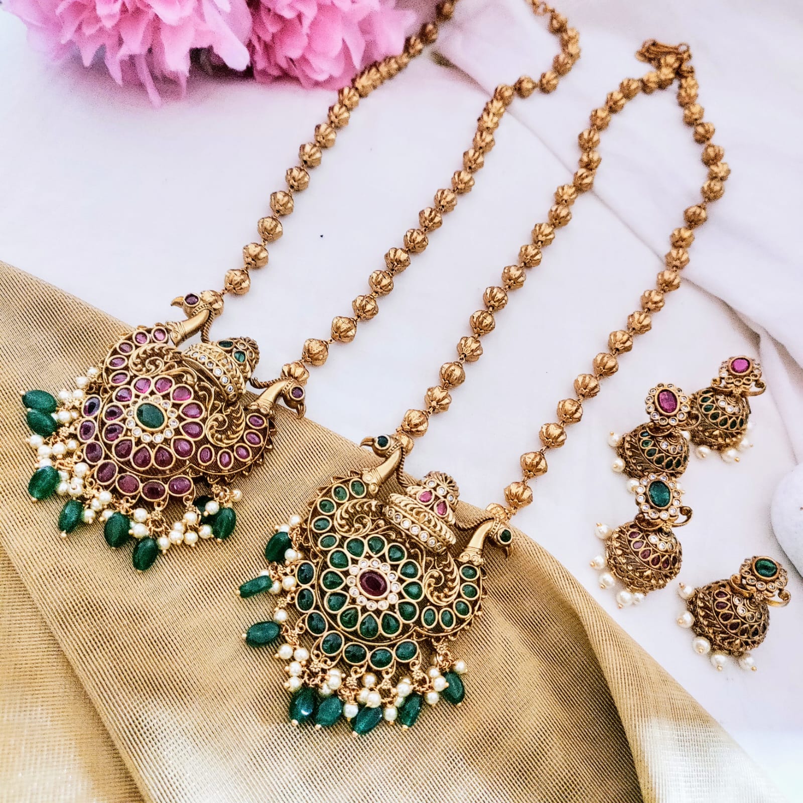 Long peacock kemp stone pendant chain set