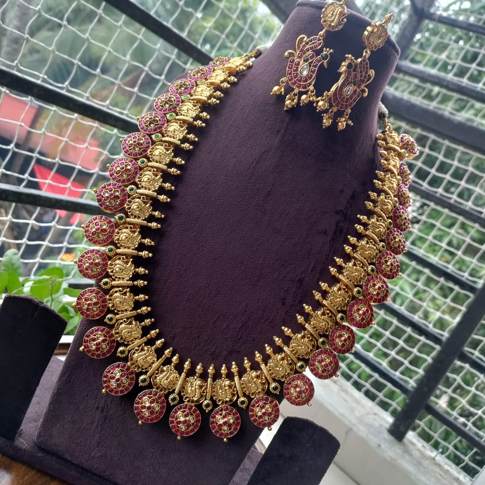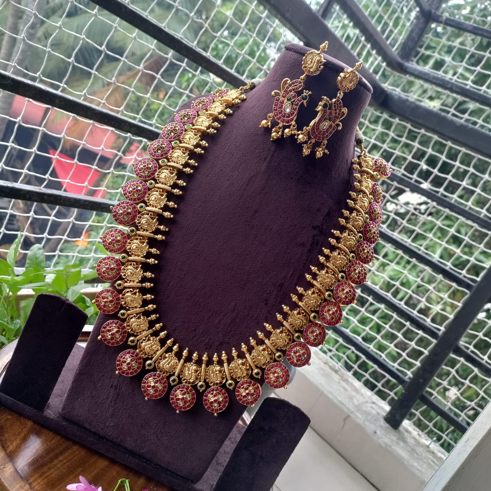 Crafted with care, a luxurious extended necklace showcasing kemp beads elegantly strung together. Complemented with a set of matching earrings.
