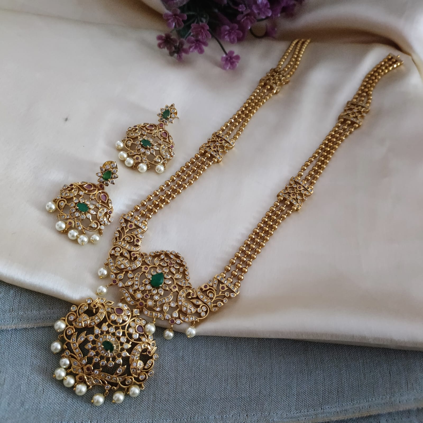 A luxurious golden necklace with white stones and a central arrangement of striking green beads, paired with matching earrings echoing its captivating blend of elegance and allure.