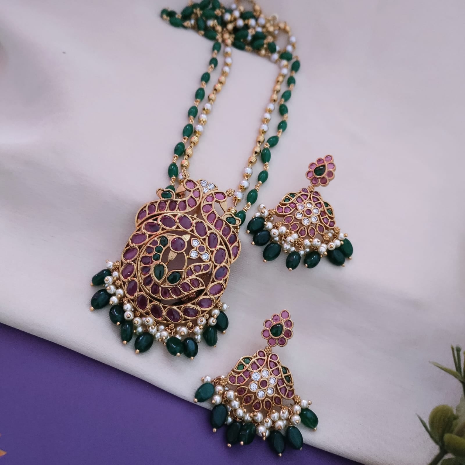 A dual-layered necklace featuring vibrant ruby kemp stones, lush green oval beads, and classic pearls, paired with matching earrings reflecting its stunning craftsmanship and colourful elegance.