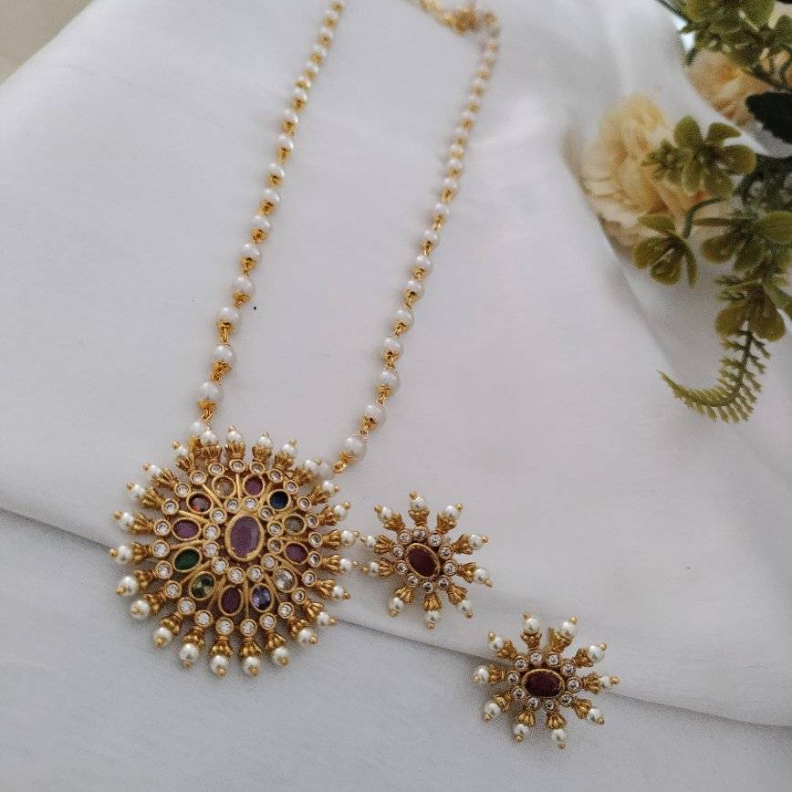 Long necklace beautifully balanced with gold and pearls, adorned by a harmonious blend of kemp and white stones. This striking set is completed with matching earrings.