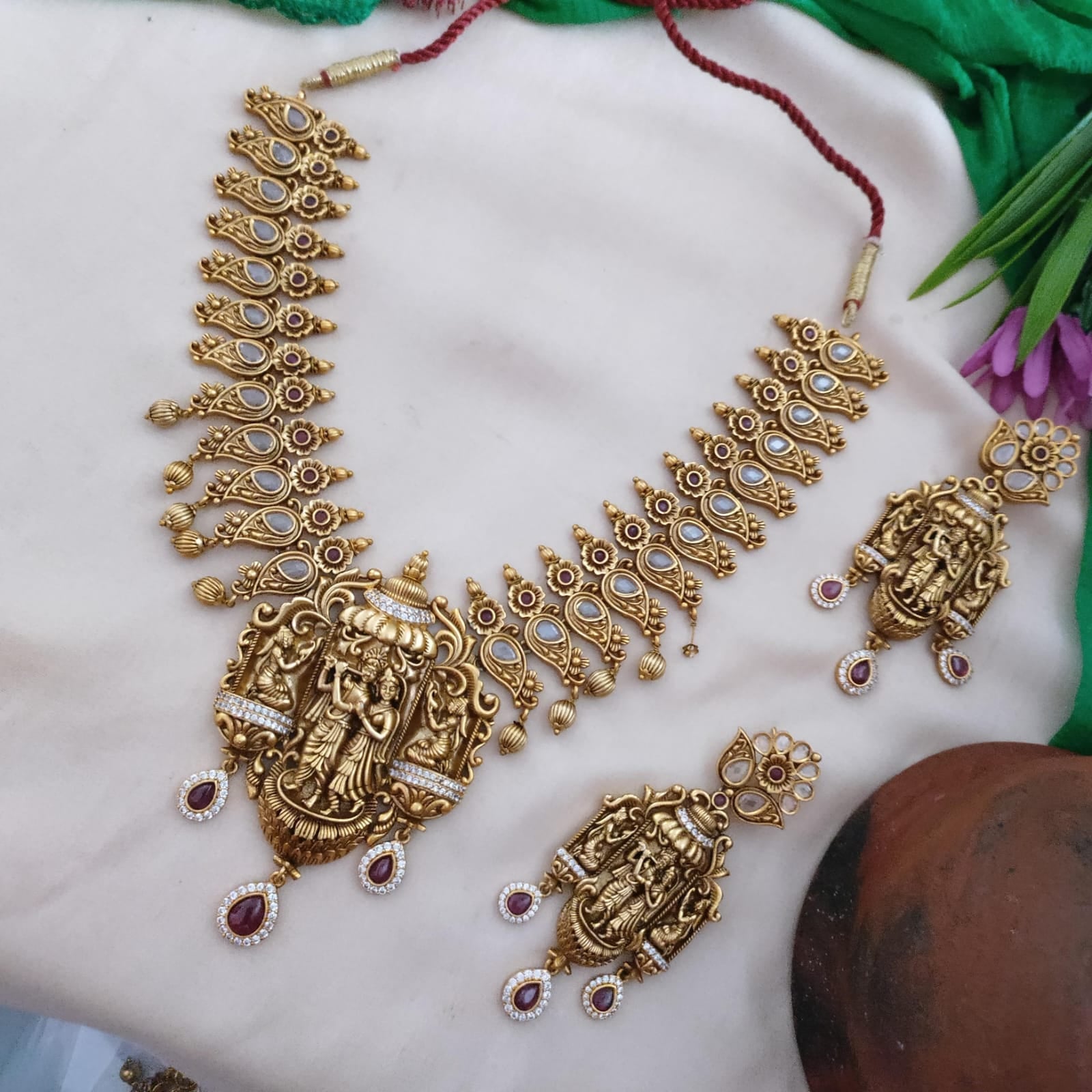 A long necklace with a pendant portraying the divine figures of Radha Krishna, adorned with delicate floral designs running along its length. This celestial ensemble is completed with matching earrings.