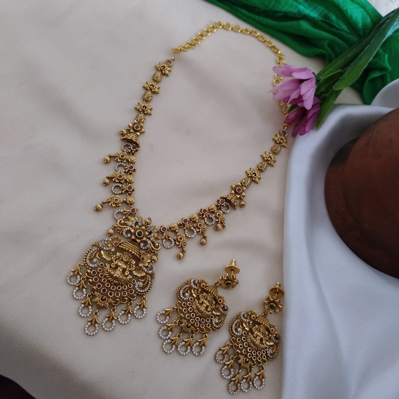 A long necklace featuring divine sculptures alongside intricate floral designs, complemented by delicate round white stone hangings. Accompanying this grand piece are matching tremendous earrings creating a striking and majestic ensemble.