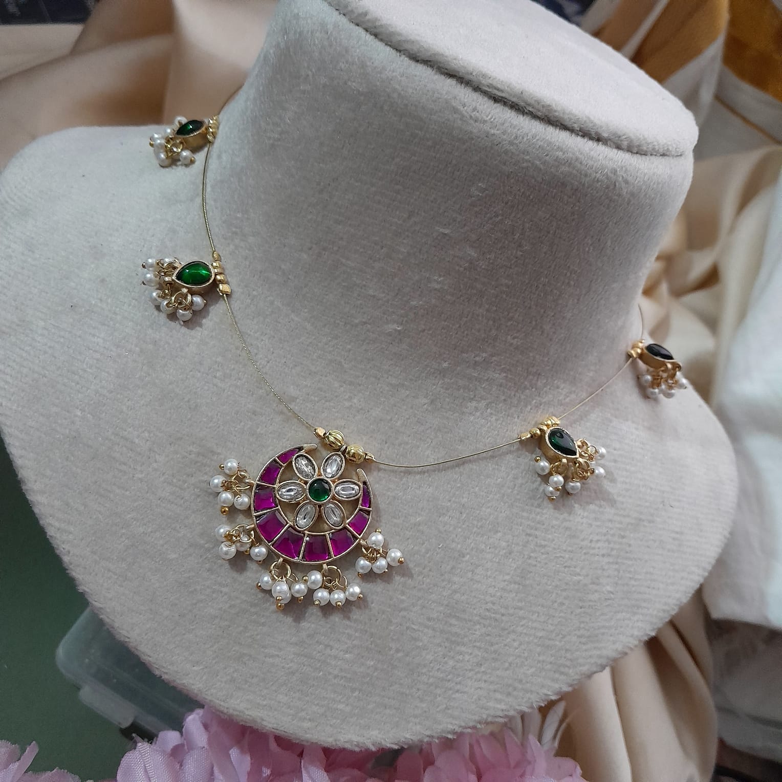 Made in brass, jadau kundan pendant with semiprecious stone necklace set.