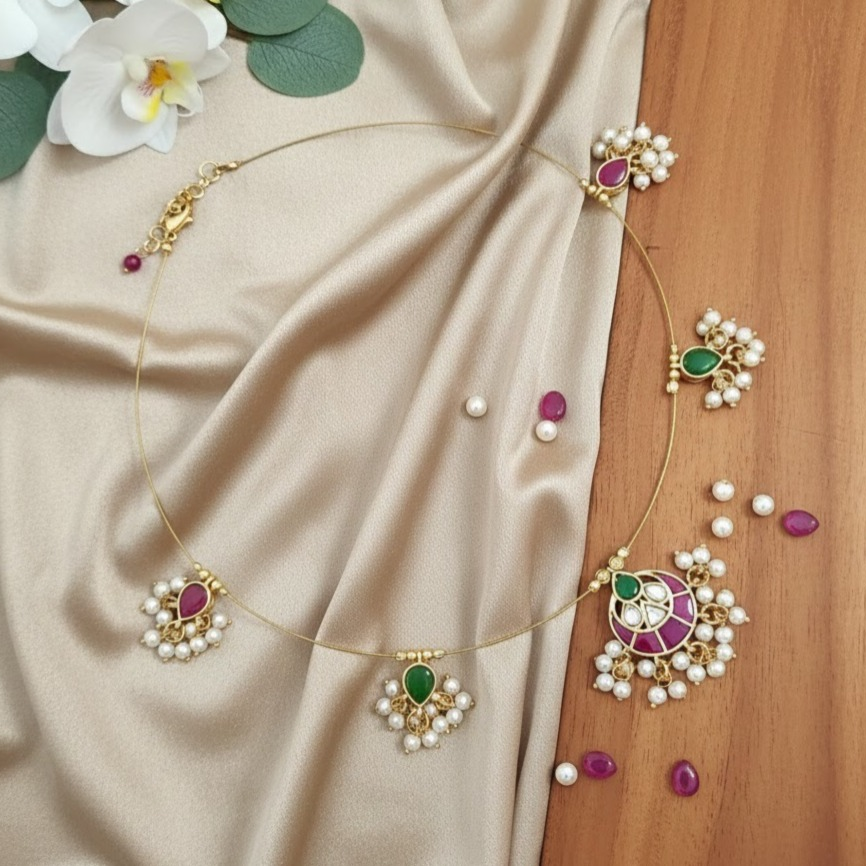 Made in brass, jadau kundan pendant with semiprecious stone necklace set.