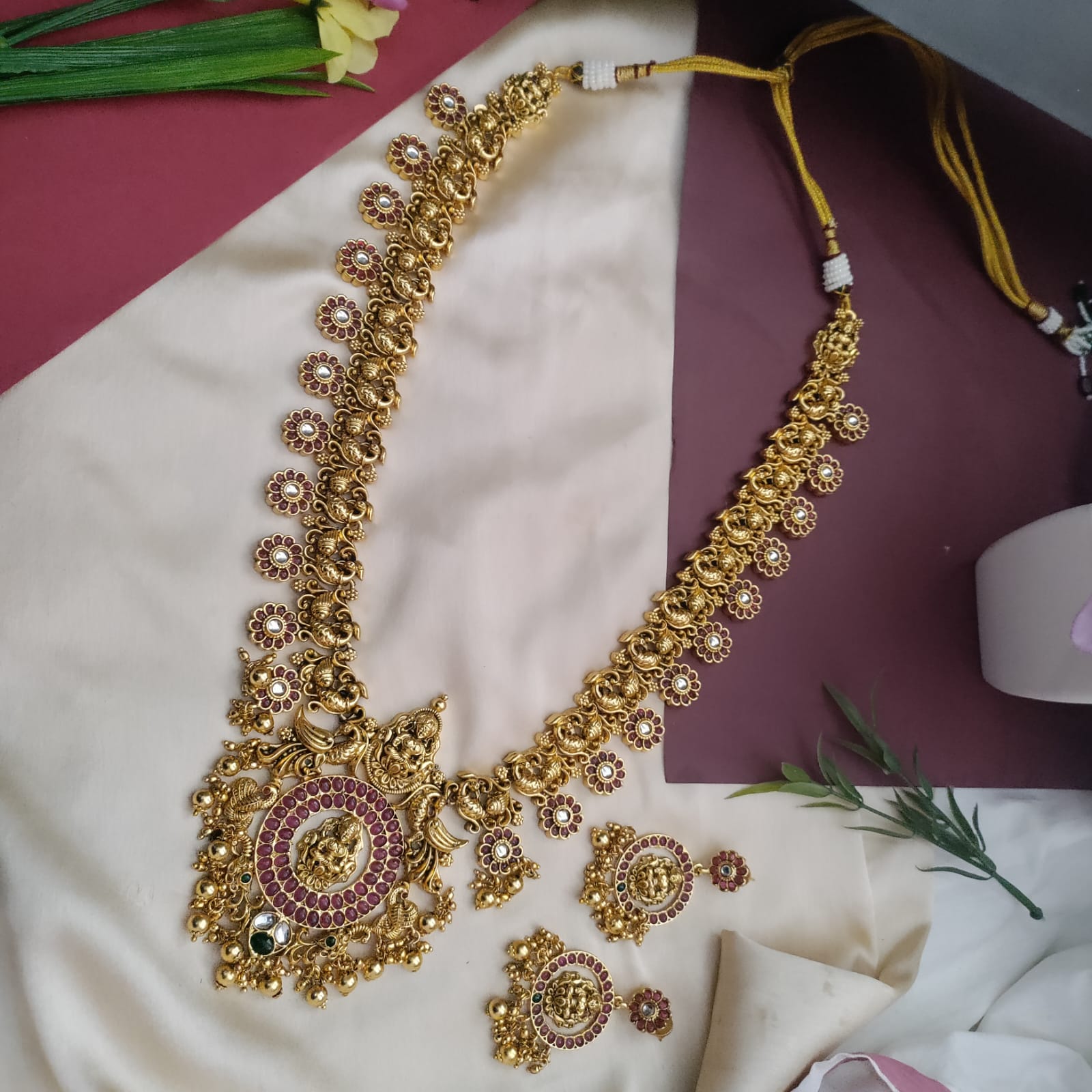 Peacock with kemp round motif bridal long necklace set with gorgeous pendant