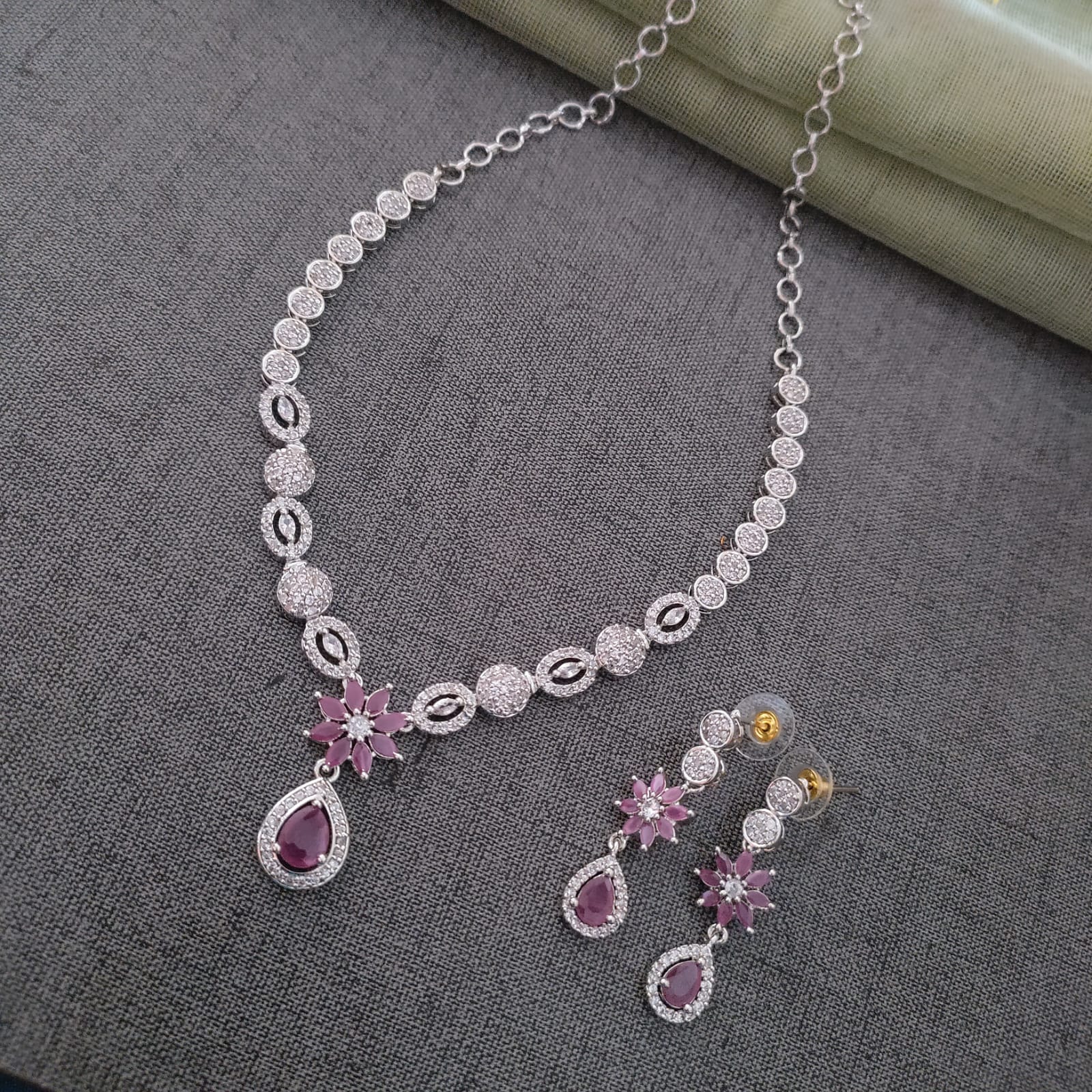 An American diamond set adorned with a intricate ruby ruby floral pattern at its centre, featuring a graceful drop pendant, and complemented by matching earrings for a charming and cohesive ensemble.