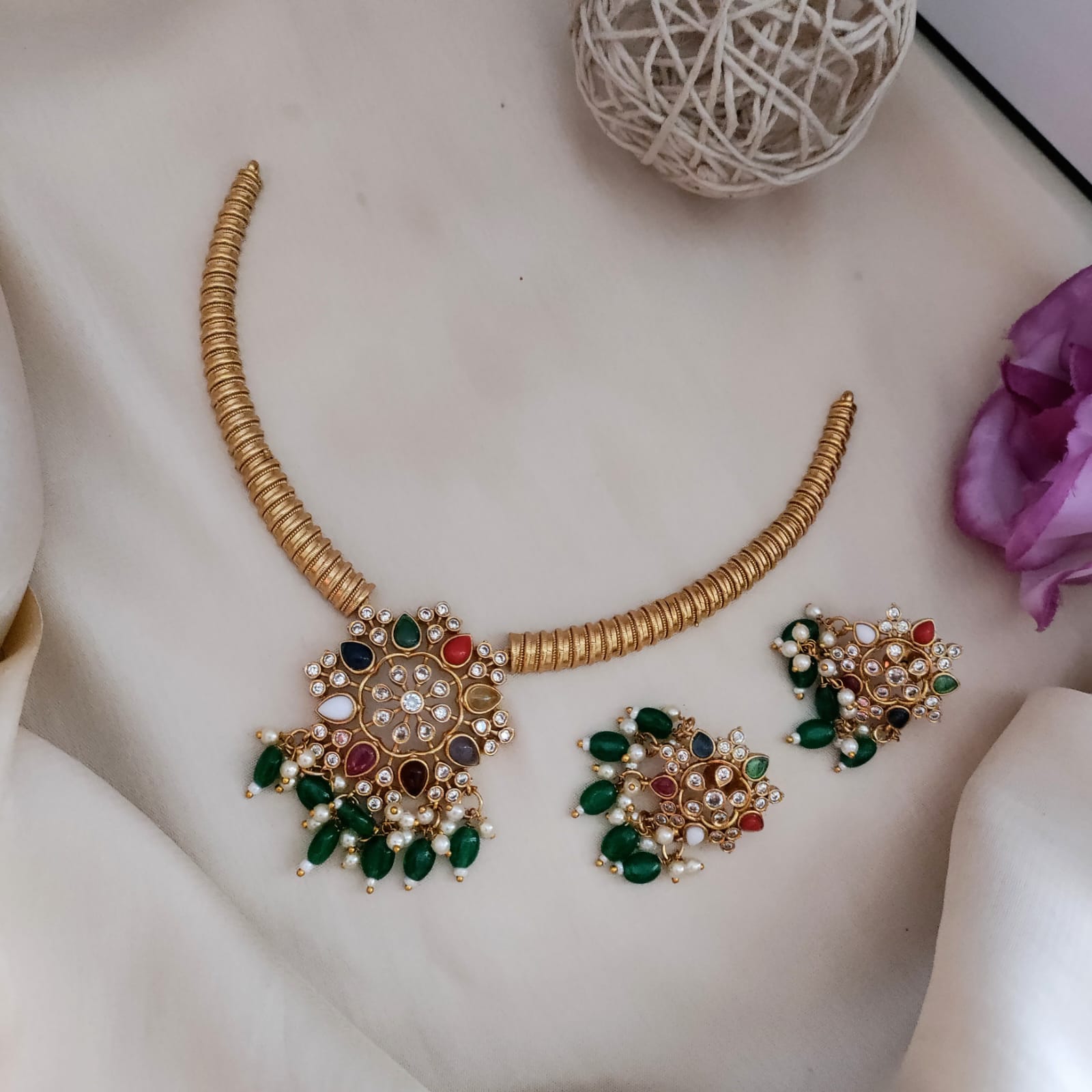 The Kemp pendant, featuring intricate floral patterns and adorned with vibrant Kemp stones, exudes timeless elegance. The tube necklace, likely designed with a contemporary flair, provides a sleek and modern backdrop to the ornate pendant.
