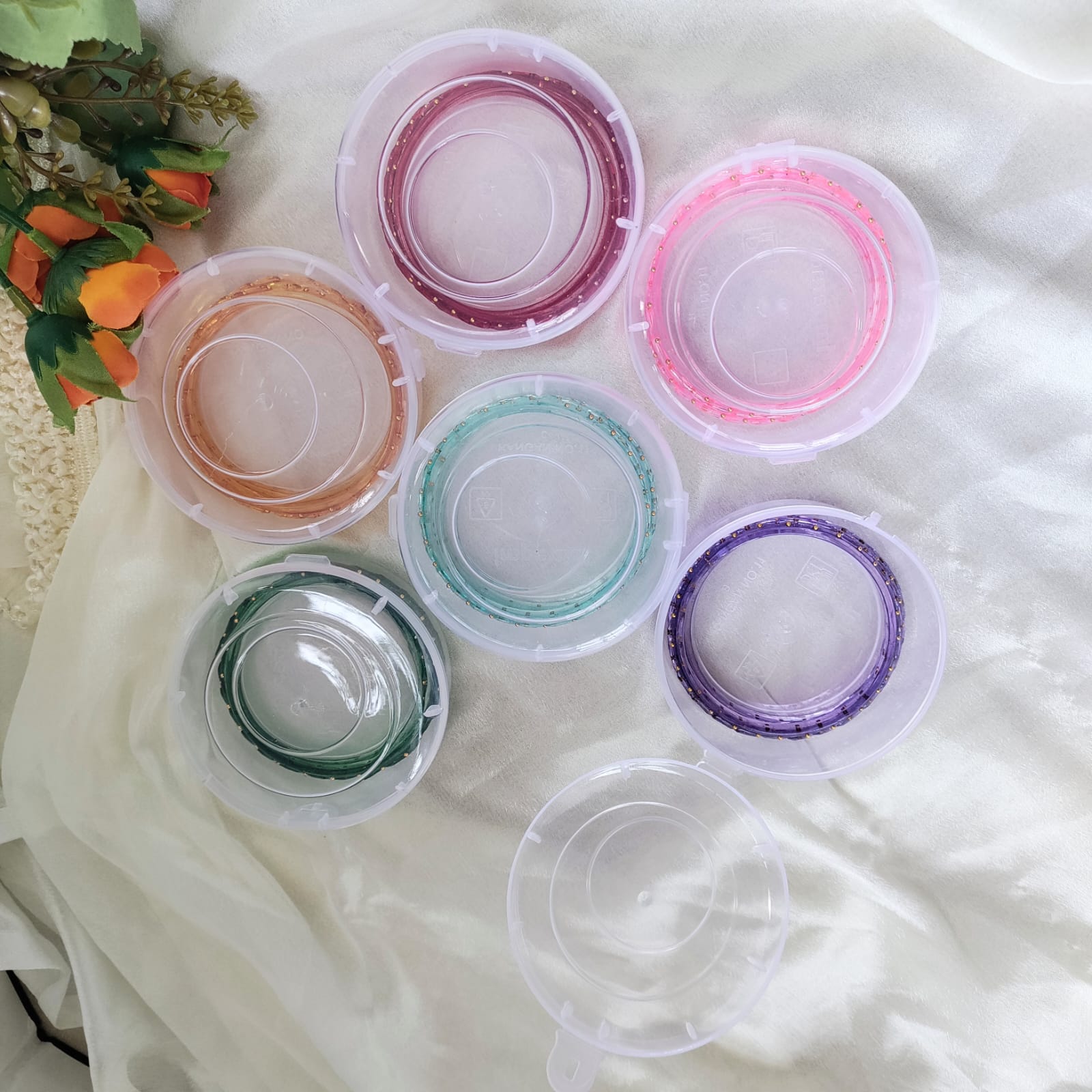 The price mentioned for 6 pack, 24 pcs, 4 bangles of 6 shades. Comes in a plastic box with 4 bangles in a pack. Total 6 packs